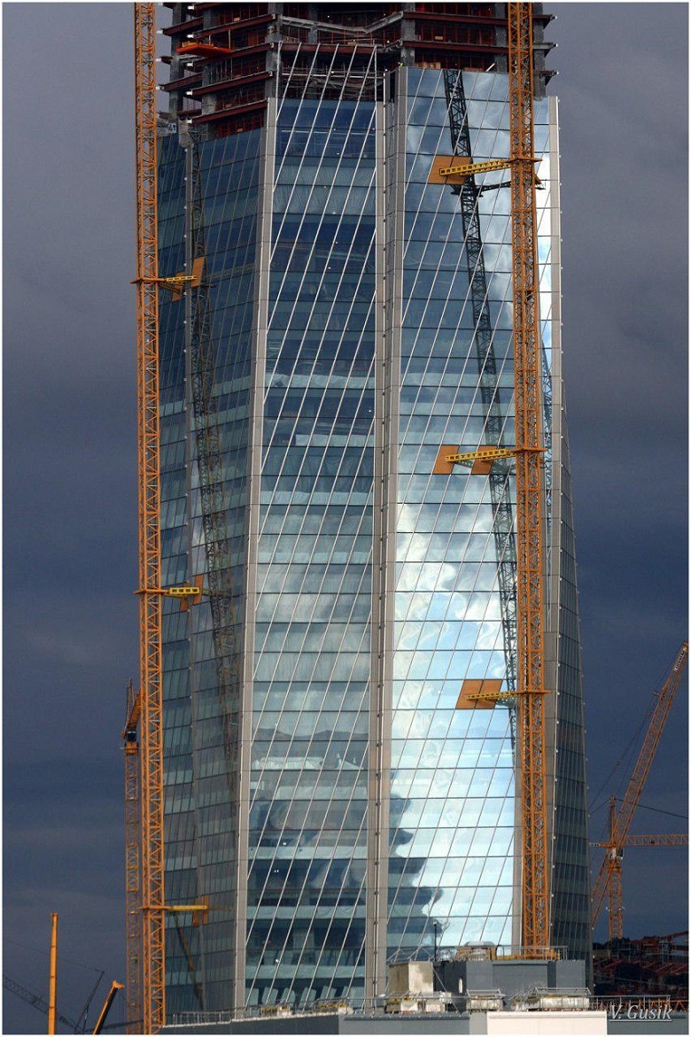 Меня такое сравнение даже немного радует – в нем чувствуется романтичный взгляд на строительные реалии. Однако дальнейшая «легендизация» небоскреба в этом направлении вскоре станет невозможной. Сказочного вида сверхмассивное ядро и хардкорный остов из металлов и композитов уже через полгода окончательно обернутся в стекло и навсегда скроются из виду.