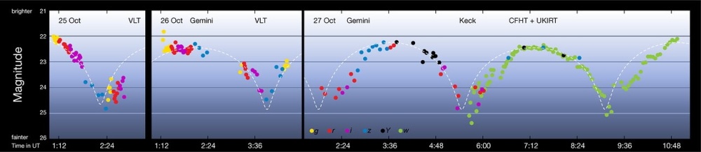 Изменения яркости Оумуамуа по данным телескопов за три дня, изображение ESO/K. Meech et al