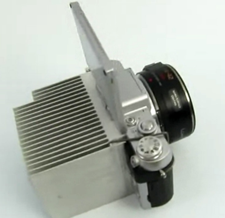 беззеркальной камеры Panasonic Lumix DMC-GF7"> в процессе видеосъемки. Он выбрал наиболее прямолинейный подход и прикрепил к аппарату алюминиевый радиатор. Благо, конструкция камеры с отклоняемым вверх экраном и плоской задней поверхностью корпуса делает такое решение простым и эффективным.