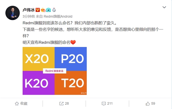Что касается названия, то Лю Вейбинг в другом сообщении в Weibo опубликовал картинку из четырех квадратов, в каждом – возможное обозначение нового флагмана. Один из них реальный, пользователи соцсети должны угадать, какой именно. Ранее в Сети уже засветились варианты X20 и K20 – скорее всего, какой-то из них и является коммерческим обозначением модели. На голосование и обмен мнениями отводятся сутки, завтра топ-менеджер объявит реальное название модели.