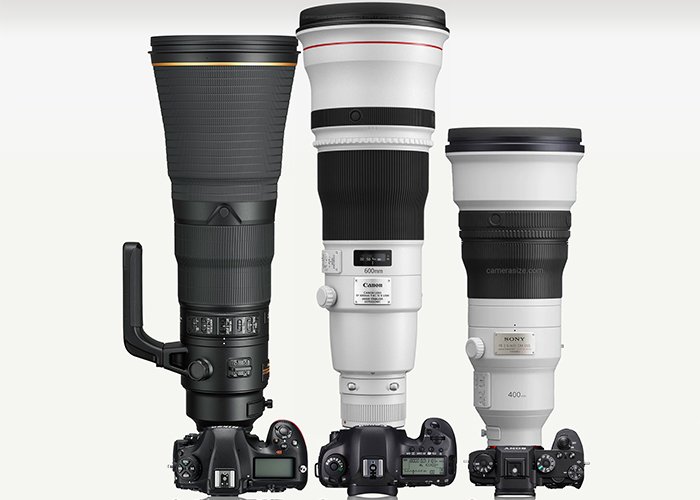 Для сравнения: объективы Nikon и Canon с таким сочетанием фокусного расстояния и максимальной диафрагмы стоят менее 13 000 долларов. На иллюстрации показаны эти объективы и модель Sony FE 400mm f/2.8 GM OSS стоимостью 12 000 долларов (крайняя справа).