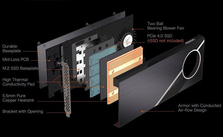 Адаптеры PCIe со слотами M.2 — не редкость, но изделие, представленное компанией Gigabyte под названием Aorus Gen4 AIC Adapter, стало первым, которое сертифицировано для работы с накопителями, оснащенными интерфейсом PCIe 4.0.