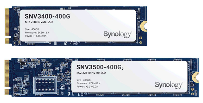 Серии Synology SNV3400 и SNV3500 пока представлены одним вариантом объема — 400 ГБ. Это накопители с интерфейсом PCIe 3.0 x4, выполненные в типоразмере M.2 2280 и M.2 22110 соответственно. Различие между SNV3400 и SNV3500 заключается в том, что в SNV3500 есть защита от потери данных при сбое питания. Эти накопители оптимизированы для рабочих нагрузок, в которых преобладает чтение. Они рассчитаны на 0,68 полной перезаписи в день, а производительность на операциях чтения достигает 205 000 IOPS. В режиме записи производительность существенно скромнее — 40 000 IOPS.