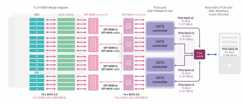 Карта расширения Qnap QXP-1600eS-A1164 обеспечивает подключение до 16 накопителей с интерфейсом SATA 6 Гбит/с