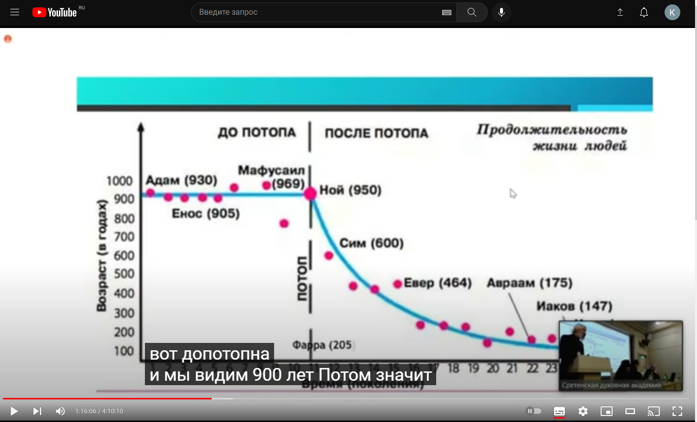 Но вот затем, понеслась «она» по кочкам. «Грех и тление — поражают биологическую природу человека». Будто раньше, до всемирного потопа, все люди жили по тысяче лет — потому что не грешили. Потом стали грешить сильнее и продолжительность жизни начала сокращаться. Все это на фоне графика из КДПВ «вот график, его можно найти в интернете, я сам его строил». Далее началось изнасилование статистики на тему генных заболеваний. И самая мякотка: