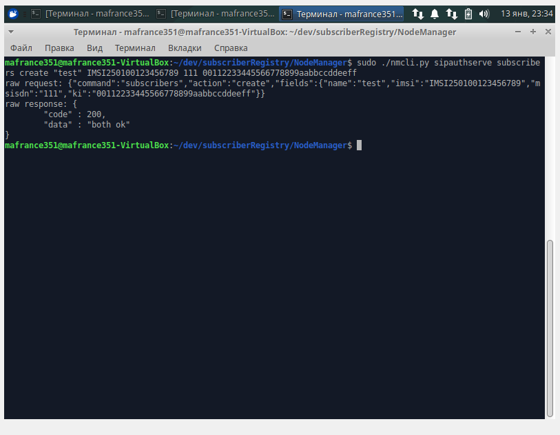 Теперь нужно занести в базу абонента. Для этого существует скрипт nmcli.py. В моём случае забитые в SIM-карту данные следующие: