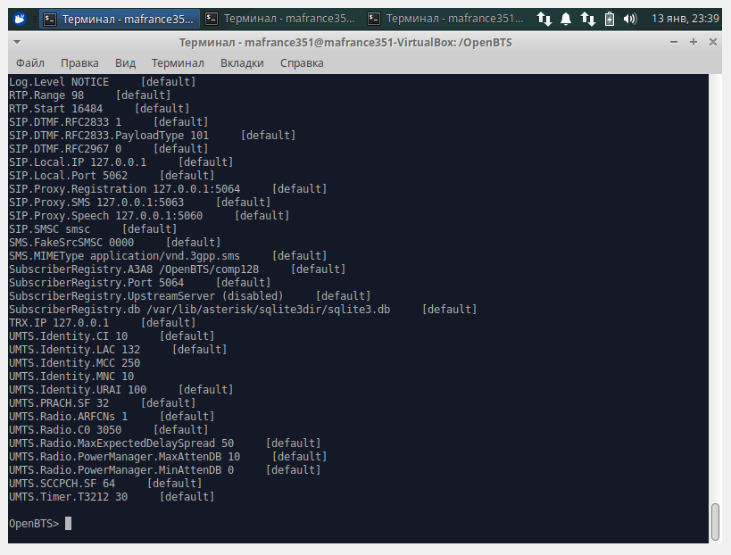 Итак, будем считать, что софт собрался. Запустив OpenBTS, можно увидеть примерно следующее: