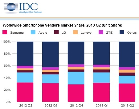 После отчётов мобильных гигантов Samsung и Apple было интересно посмотреть на рынок смартфонов в целом. Аналитики компании IDC подсчитали, что рынок смартфонов за второй квартал 2013 года вырос на 52,3% в сравнении с аналогичным периодом прошлого года. В количественном выражении это составляет 237,9 млн. смартфонов. Рынок же мобильных телефонов в целом показал рост лишь на 6% (до 432,1 млн. устройств).