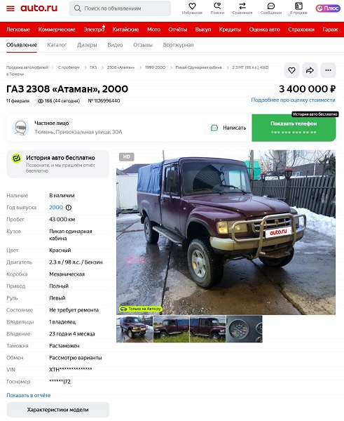 В Тюмени на продажу выставили редчайший пикап «Атаман» ГАЗ-2308: машину с лицом «Волги» и кабиной от грузовика ГАЗ-3307, оценили в 3,4 млн рублей. Цена немалая, учитывая, что за такие деньги можно купить новенький JAC T8, но и состояние у «Атамана» неплохое: за 24 года пробег составил всего 43 тыс. км. Еще большей ценности придает тот факт, что всего было выпущено несколько десятков таких машин.
