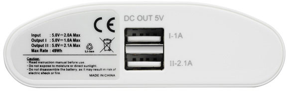 Емкость батареи — 13600 мА∙ч. Важной особенностью батареи является наличие двух разъемов USB, что позволяет ей заряжать одновременно сразу два устройства. Один порт способен обеспечить в нагрузке ток до 1,0 А, а второй — до 2,1 А. Это дает возможность быстро подзаряжать совместимые устройства, такие, как Apple iPad.