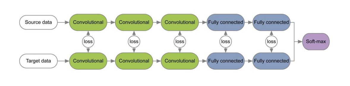 В ряде работ при обучении сетей для исходного и целевого доменов с помощью loss-функций для каждой пары слоёв изучается на весах этих слоёв информация, инвариантная относительно домена. Пример таких архитектур приведён ниже.