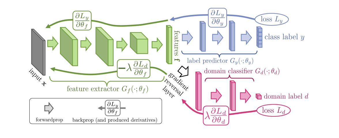 При обучении с помощью градиентного спуска (SGD) (стрелки к input на иллюстрации) минимизируются классификационный и доменный loss'ы. К тому же при обратном распространении ошибки в обучении для "головы", отвечающей за домены, используется слой Gradient reversal layer (чёрная часть на иллюстрации), который умножает проходящий через него градиент на негативную константу, увеличивая доменный loss. Этим добиваются того, что распределения векторных представлений на обоих доменах становятся близки.