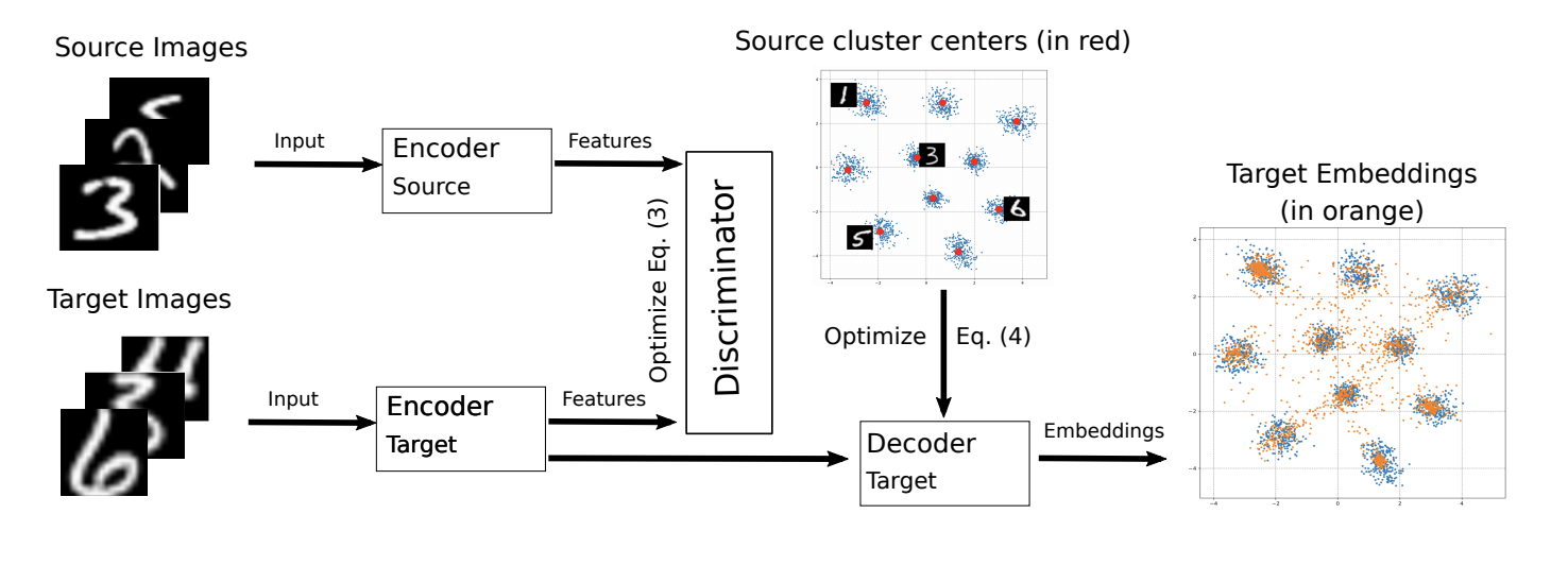 Шаги 3 и 4 повторяются несколько раз. Суть ADDA заключается в том, что мы сначала обучаем хороший классификатор на размеченном исходном домене, а затем с помощью adversarial-обучения адаптируем так, чтобы векторные представления классификатора на обоих доменах были близки. Графически алгоритм можно представить следующим образом: