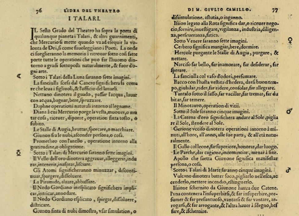 Современником Ромберха был итальянский философ Джулио Камилло (1480–1544), автор трактата «L'idea del theatro». Он предложил представить разум как амфитеатр, который одновременно сравнивал с дворцом царя Соломона. В этом «здании» он предусматривал семь колонн, по числу планет, выделяемых астрологами во времена Камилло. Под каждой из колонн он располагал украшенные галереи, изображения на стенах которых иллюстрировали различные сюжеты и идеи. Вот один из разворотов трактата, где информация ассоциируется с планетами: