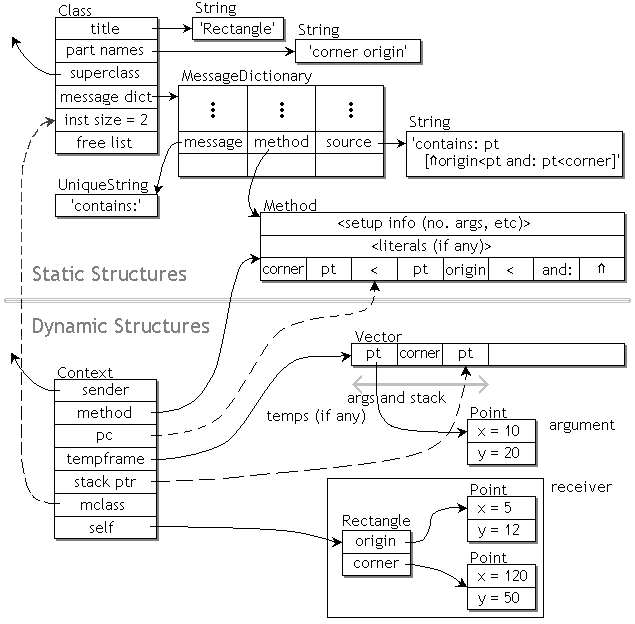 Чтобы язык можно было использовать на различных платформах, его реализовали в виде виртуальной машины (Virtual Machine, VM) и виртуального образа (Virtual Image, VI). VI представлял собой библиотеку классов, в которой реализована функциональность Smalltalk, включая определение структур данных, методов работы с текстами и графикой, компиляторы, декомпиляторы, отладчики. Компилятор генерировал код на промежуточным языке, названном byte codes. VM обеспечивала интерпретацию байт-кодов на любой платформе. Все это вызывает ассоциации с Java на уровне подкорки. Это говорит о той серьезной роли, которую сыграл SmallTalk в программировании.
