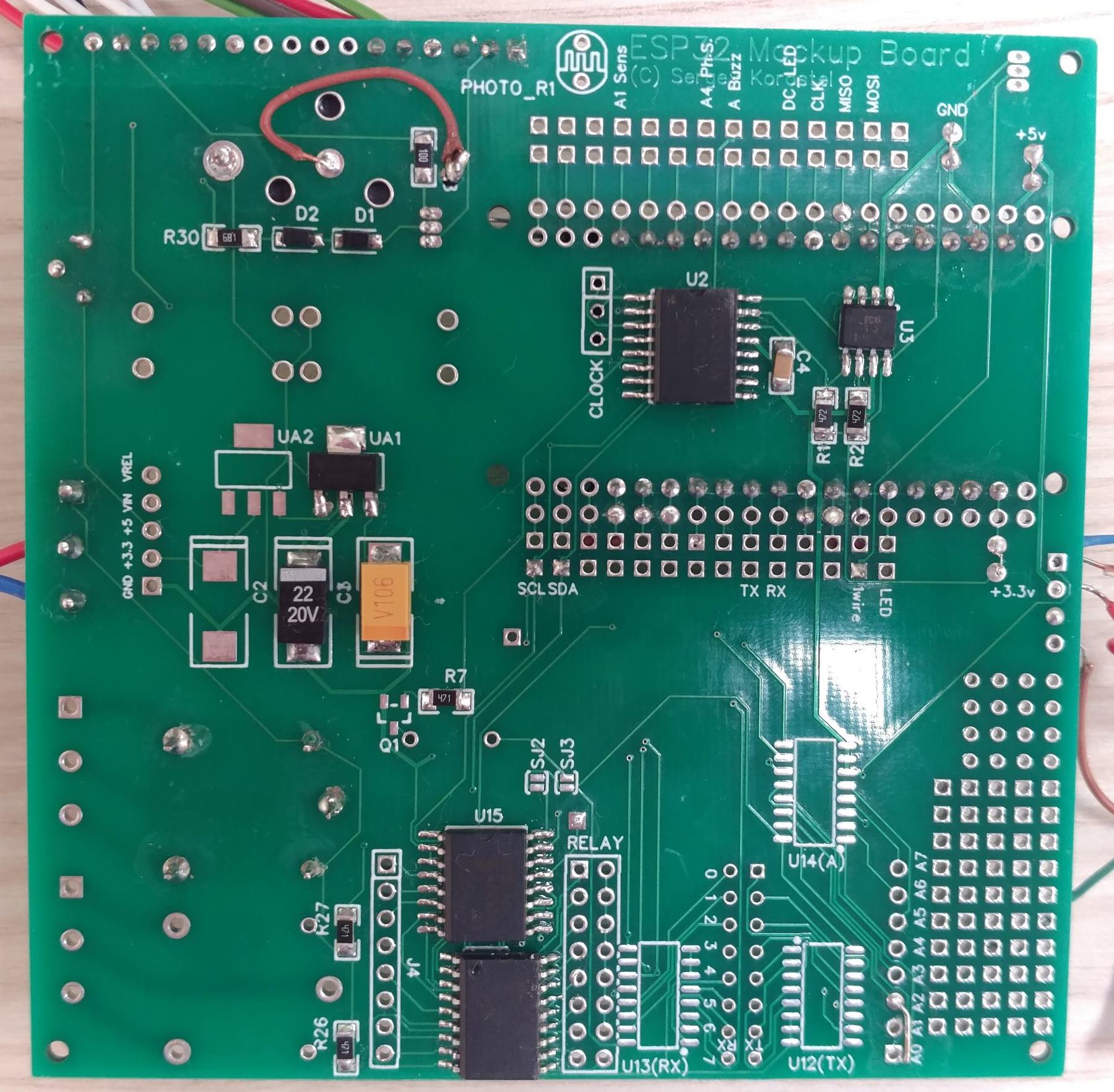 Первая же сложность с которой я столкнулся: вариантов DevKit контроллера ESP8266 или ESP32 существует достаточно много, некоторые из них отличаются расположением выводов и их назначением, а некоторые даже по ширине. Решено было разрисовать схему так, чтобы можно было поставить DevKit любой ширины и с любым расположением выводов, а по сторонам от него — по 2 ряда парных отверстий-перемычек, и впоследствии проводками соединить нужные выводы, применительно к конкретно купленному контроллеру.