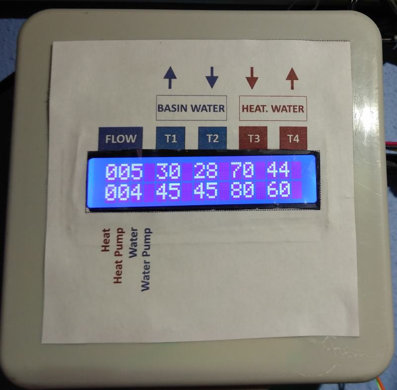 В устройстве использован дисплей QC1602A, способный отображать 2 строчки по 16 символов. В первой строке выводится актуальная информация о текущих значениях датчиков: потока и температурах. В случае превышения заданного лимита, возле значения появляется восклицательный знак. Вторая строчка показывает состояния реле нагрева и насоса, а также время, прошедшее с момента включения или выключения нагрева. Каждые 5 секунд дисплей во второй строке кратковременно показывает актуальные лимиты. Фотографии дисплея в различных режимах приведены в конце публикации.