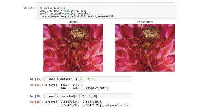 (или для данных по умолчанию). Необходимо лишь указать константу масштабирования. Более того, класс ImageDataGenerator позволяет направлять данные потоком напрямую из папки на жестком диске, используя метод flow_from_directory.