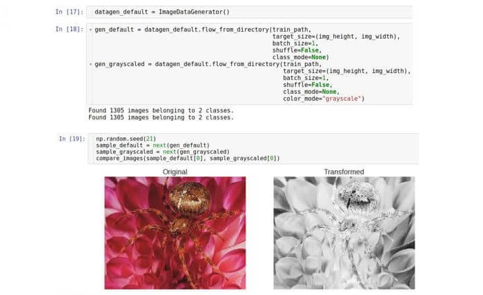 Здесь мы создаем только один экземпляр класса и берем из него два разных генератора. Второй генератор устанавливает параметр color_mode в “grayscale” (значение по умолчанию “RGB”).