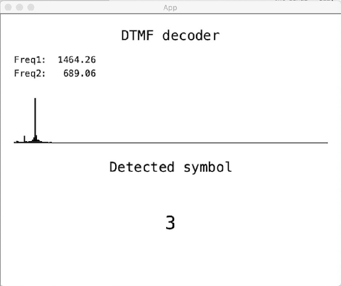 - определим какие частоты из таблицы соответствуют найденным (с некоторым допуском ±35 Hz) и найдем искомый символ
