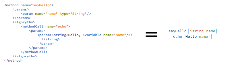 Для этого в первую очередь нам потребуется хранить исходные коды в другой форме. Они должны представлять собой описание инструкций и данных программы в одной из существующих форм хранения данных, таких как json, xml или любой другой. Этот файл (рисунок 1, слева) может иметь довольно безобразный вид и не поддаваться хоть сколько-нибудь разумному способу его прямого редактирования, однако в среде программирования он будет превращаться в блочный код (рисунок 1, справа).