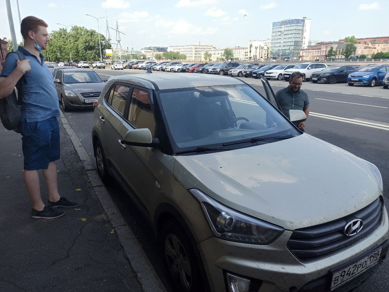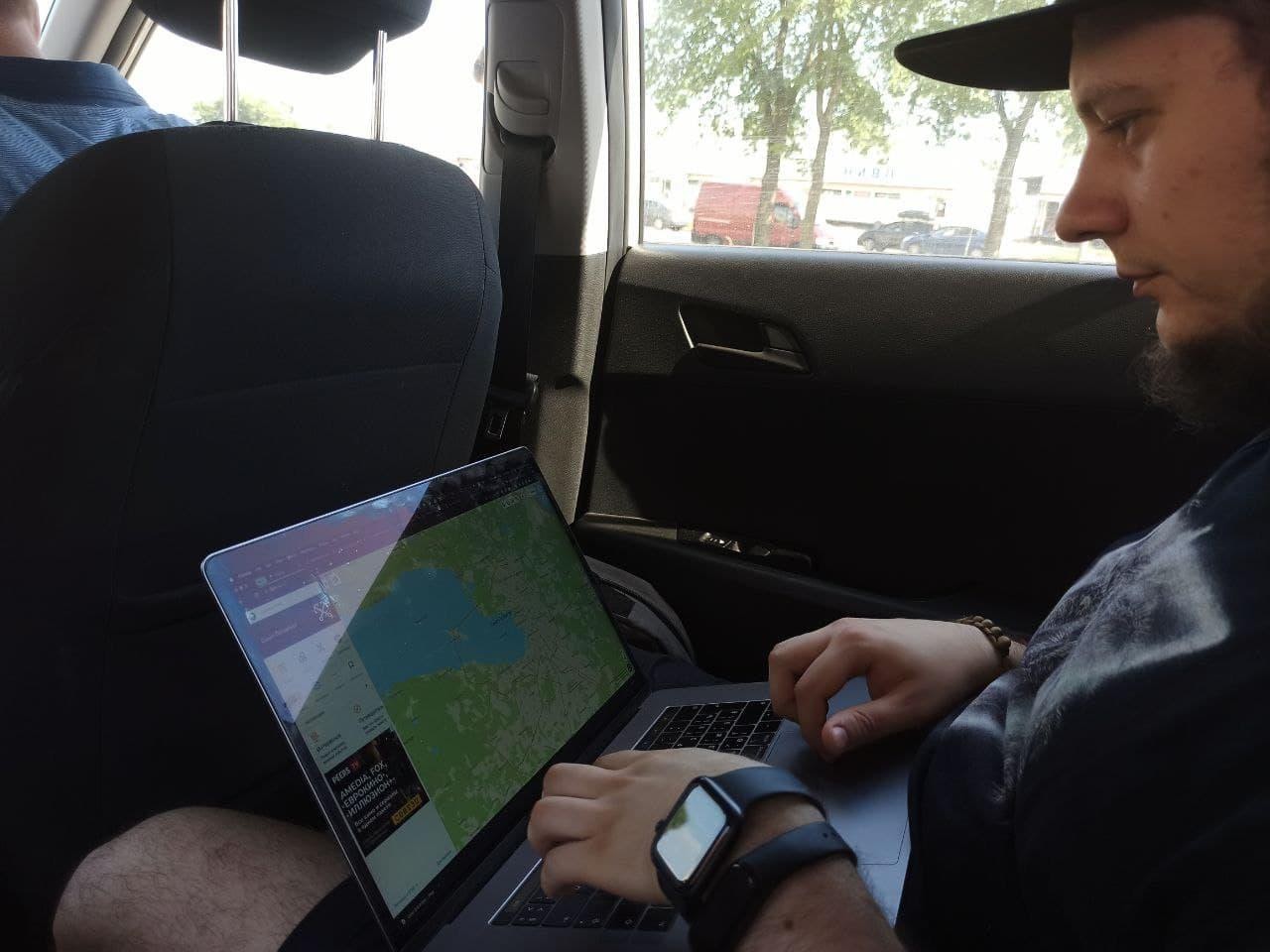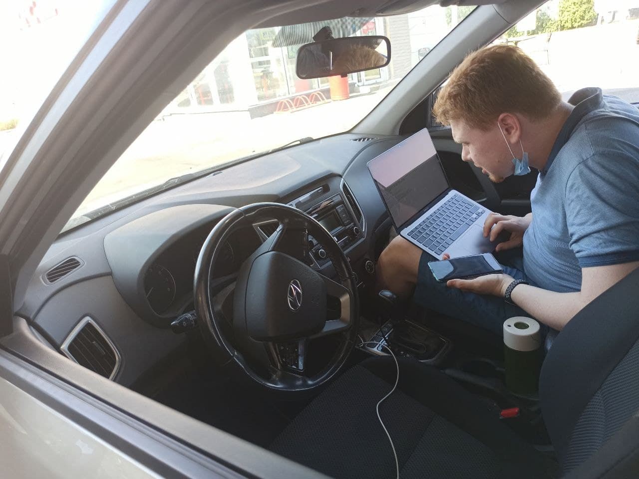 Разомлевший на жаре (на улице июньские 34 градуса!) заправщик у соседней колонки лениво смотрит на происходящее. Кажется, его не удивляет, что два человека в салоне с ноутбуками постоянно что-то кричат третьему — и тот как будто делает всё по команде. Есть ещё один, четвёртый — он бегает и снимает это на телефон.