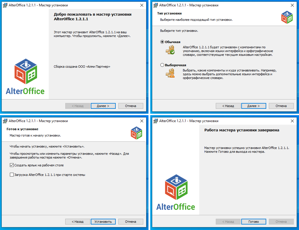 Сам инсталлятор особо ничем не примечателен. Меня слегка удивило в нём наличие слова «сборка». Если AlterOffice позиционируется как собственный продукт, то из чего, простите, его собирали?