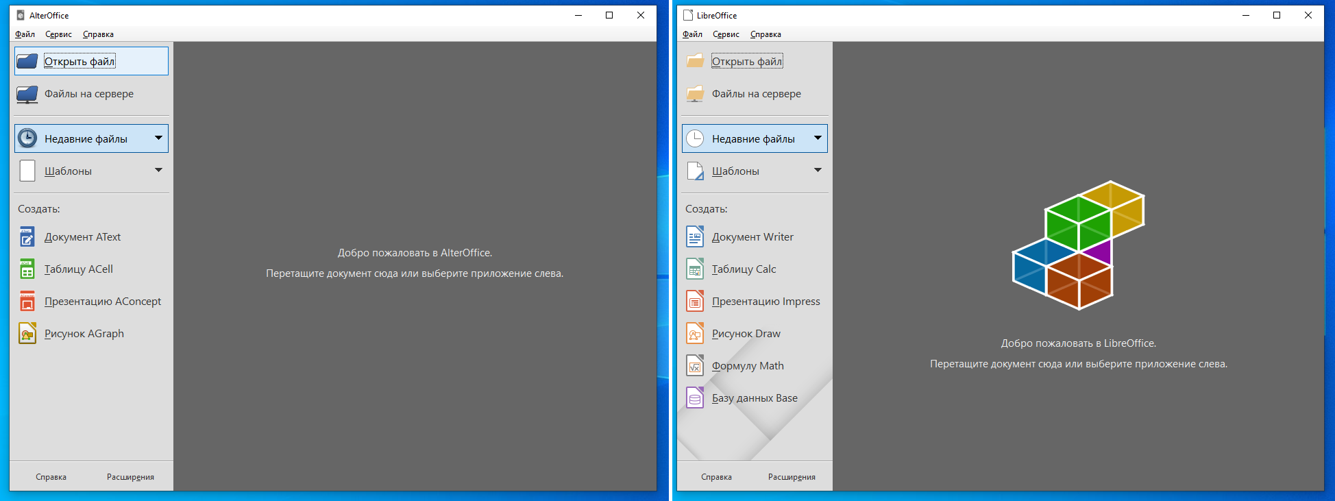 Начнем с самого офисного пакета. Как и в прошлый раз, это никакая не собственная разработка нижегородских программистов, а самый обычный LibreOffice. Запустим и то, и другое и сравним: