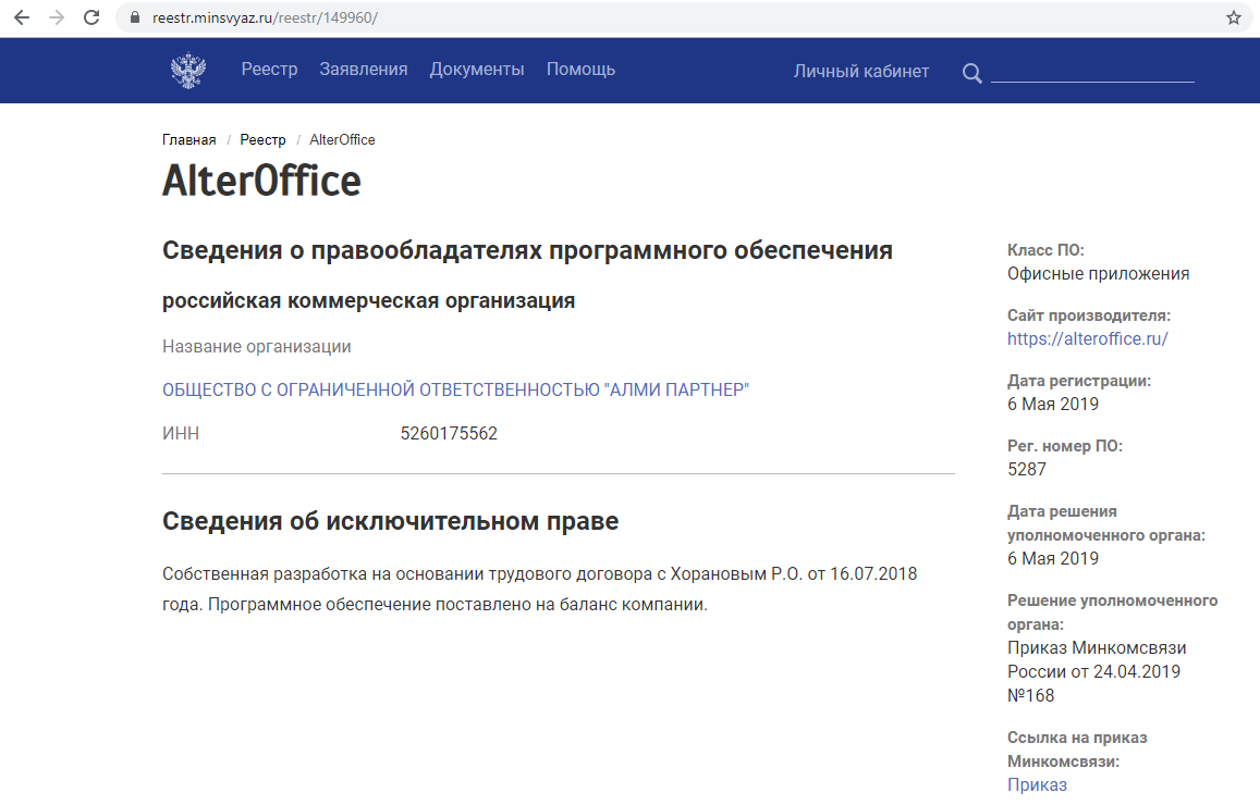 Другими словами — после замены буквы в приказе AlterOffice может снова подаваться на включение в Реестр. Хм. Проверим заявки на сайте Минцифры — идём в раздел про реестр отечественного ПО, и видим там: