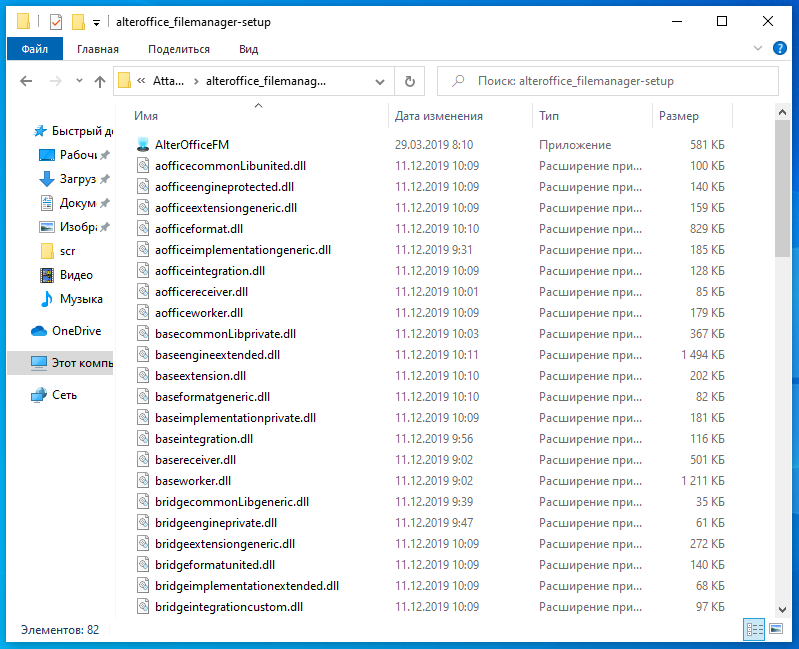 После установки AlterOffice File Manager пользователь обнаружит в каталоге этой программы 82 файла — исполняемый файл AlterOfficeFM.exe и 81 динамическую библиотеку.
