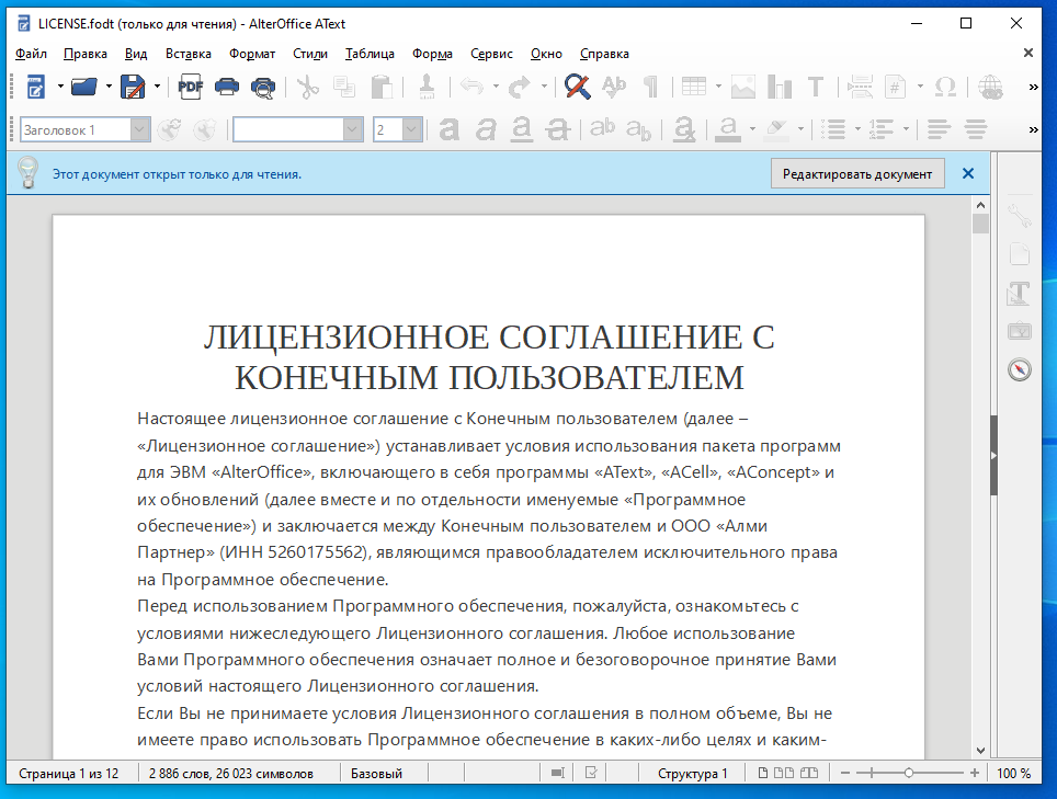Но лицензию можно найти в самих дистрибутивах — в каталоге AlterOffice присутствуют файлы License.html, License.fodt, license.txt. Их содержимое идентично. Также можно нажать кнопку «Лицензия» в меню «Справка» программы AlterOffice и увидеть тот же текст.