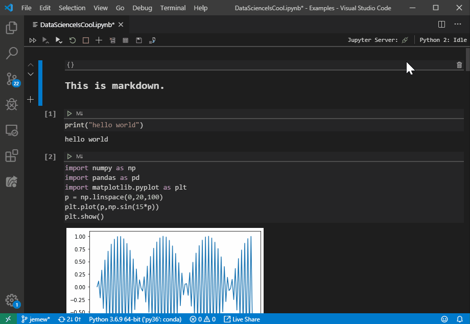 В правом верхнем углу Notebook Editor и Interactive Window теперь вы сможете увидеть текущее ядро, которое использует ноутбук, а также состояние ядра (т. е. находится ли оно в режиме ожидания, занято и т. д.). Этот выпуск также позволяет вам менять ядро на другие ядра Python. Чтобы изменить текущее активное ядро, щелкните текущее ядро, чтобы вызвать селектор ядра VS Code, и выберите ядро, на которое вы хотите переключиться, из списка.