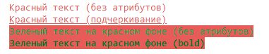 print(colored("Зеленый текст на красном фоне (без атрибутов)", "green", "on_red" ))