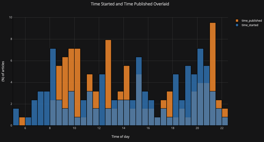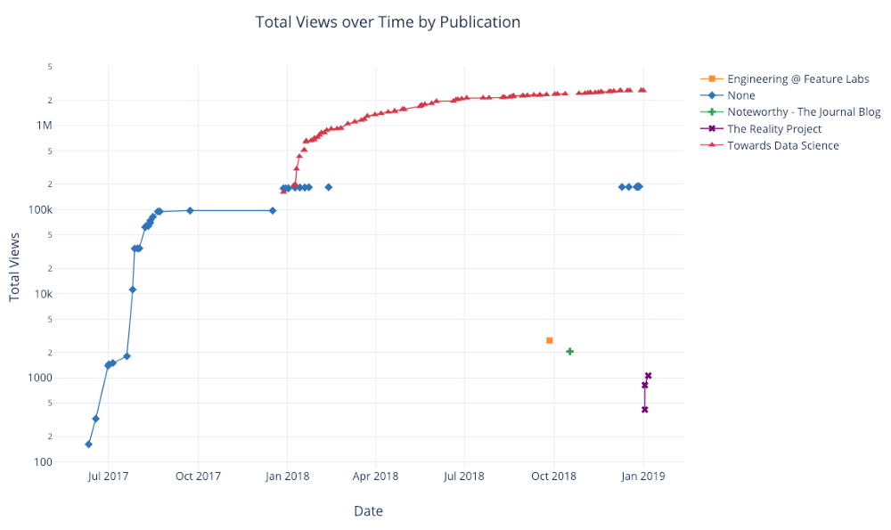 Значительная часть реальных данных имеет элемент времени. К счастью, plotly + cufflinks был разработан с учетом визуализации временных рядов. Давайте сделаем фрейм данных из моих статей TDS и посмотрим, как изменились тенденции.