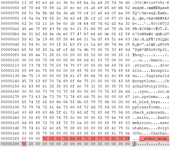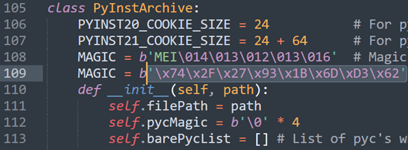 Константа MAGIC обозначает начало заголовка архива упакованных Python-файлов – “MEI1413121316”. Что ж, оказалось, что не всё так просто, видимо разработчик модифицировал PyInstaller для упаковки mhddos_proxy, а значит придётся лезть в дизассемблер.