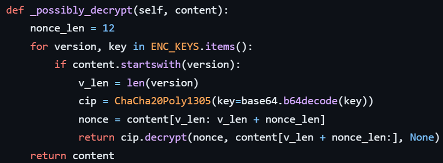 Данный метод сравнивает первые 4 байта файла со списком версий в словаре ENC_KEYS, и если есть совпадение, то расшифровывает оставшиеся данные файла соответствующим ключом из словаря с использованием алгоритма шифрования ChaCha20Poly1305. Сам словарь при этом содержит всего одну версию с ключом: