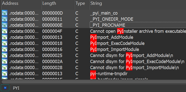 Скачиваем сборку для linux под x86 (mhddos_proxy_linux v81, MD5: a004b948f72c6eb14f348cc698bda16e) - её будет проще исследовать, чем бинарь для ARM. Открываем в дизассемблере, смотрим строки и видим характерные строки начинающиеся с _PYI: