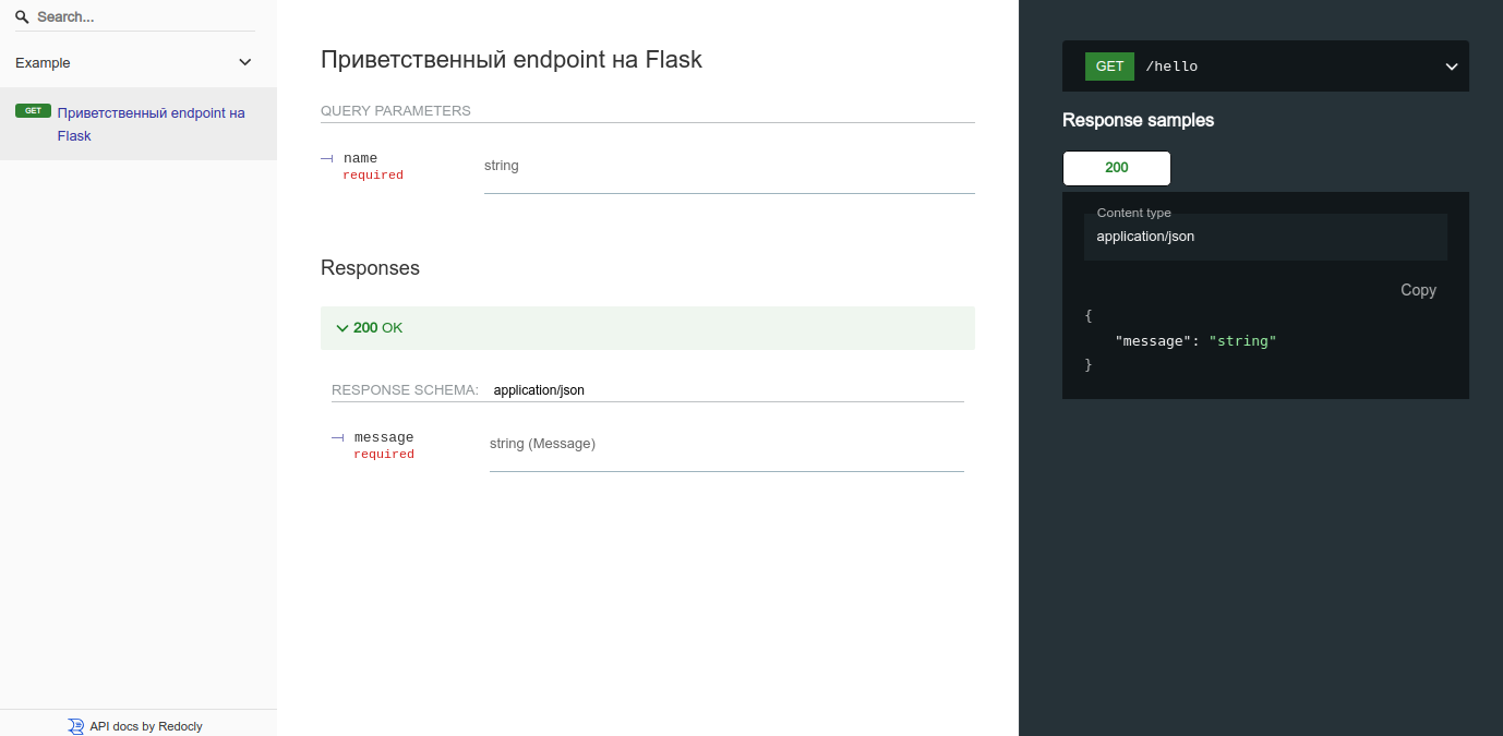 Этот код создаёт обычное Flask-приложение, но маршруты описаны через FlaskRouter. Декоратор @router.get("/hello") зарегистрирует GET-эндпоинт по пути /hello. Благодаря Pydantic-модели HelloResponse мы сразу описываем схему ответа (поле message: str), а тип параметра name: str в функции указывает на тип query-параметра. FastOpenAPI соберёт эти данные и включит в спецификацию OpenAPI: что у GET /hello есть строковый query-параметр name и ответ 200 с JSON-объектом HelloResponse.