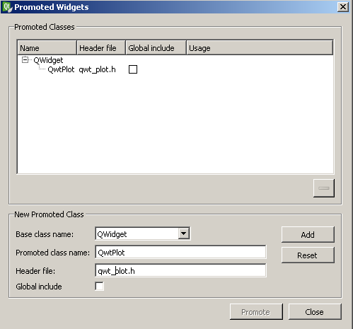 5. В поле Promoted class name печатаем «QwtPlot». В поле Header file меняем «qwtplot.h» на «qwt_plot.h». Нажимаем Add и закрываем окно.