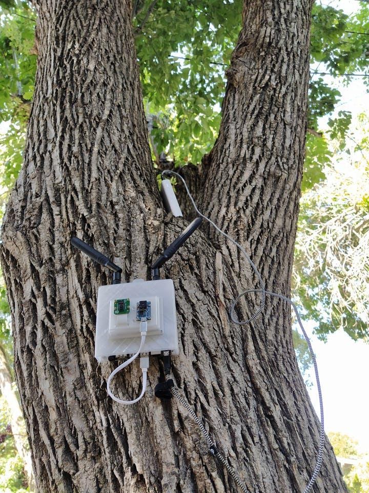 Термометр, закреплённый на дереве и получающий питание от пауэрбанка