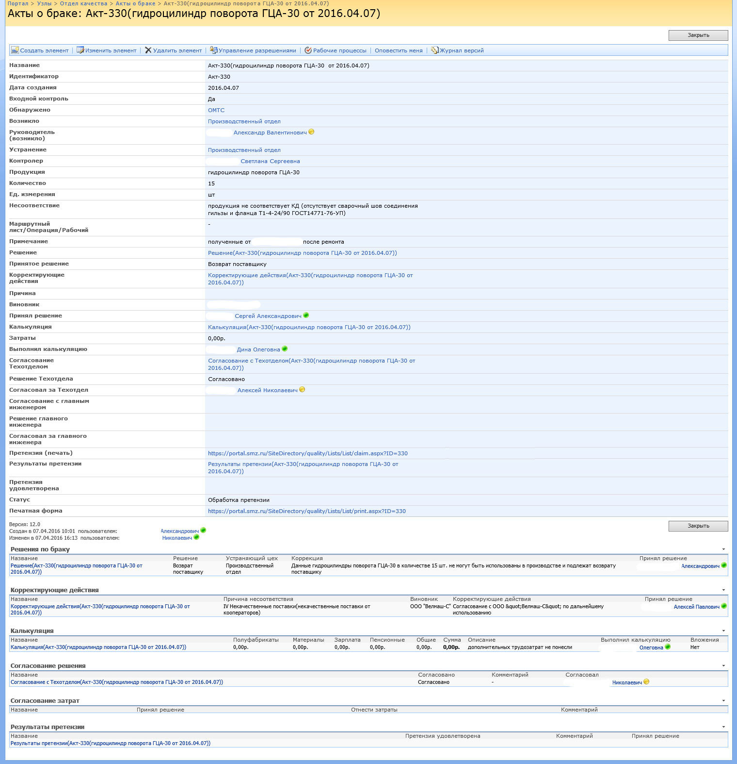 После принятие решения Главным инженером по отнесение затрат на поставщика или при отсутствии затрат, но с решением входного контроля о возврате поставщику, статус Акта меняется на «Обработка претензии», автоматически создается запись в списке «Результаты претензии» (https://portal.smz.ru/SiteDirectory/quality/Lists/List12), формируется ссылка на форму печати претензии, отправляются уведомления для Отдела качества, Главного инженера, Экономического отдела и Руководителю подразделения, где возникло несоответствие.