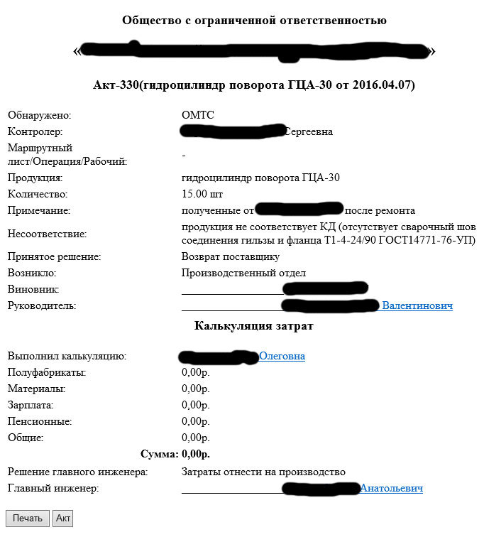 Но! Акт о браке или акт входного контроля может ходить месяц-другой с учетом выходных и праздников между подразделениями и сотрудниками предприятия. Как так? Акт входного контроля, попадая к юрисконсульту, для составления претензии поставщику уже опоздал, вышли все сроки по договору поставки для оформления возврата. А сколько таких случаев? А сколько у нас актов в работе? А на каком они этапе? А на каком этапе они застревают больше всего? Какое подразделение генерирует больше брака? А кто виновник? А кто устраняет чаще? У какого поставщика хуже качество? А сколько претензий отправлено поставщикам и без ответа? Какие мы несем затраты? И много других вопросов. Будем анализировать бумажные журналы и папки с актами, объяснительными, калькуляциями затрат?