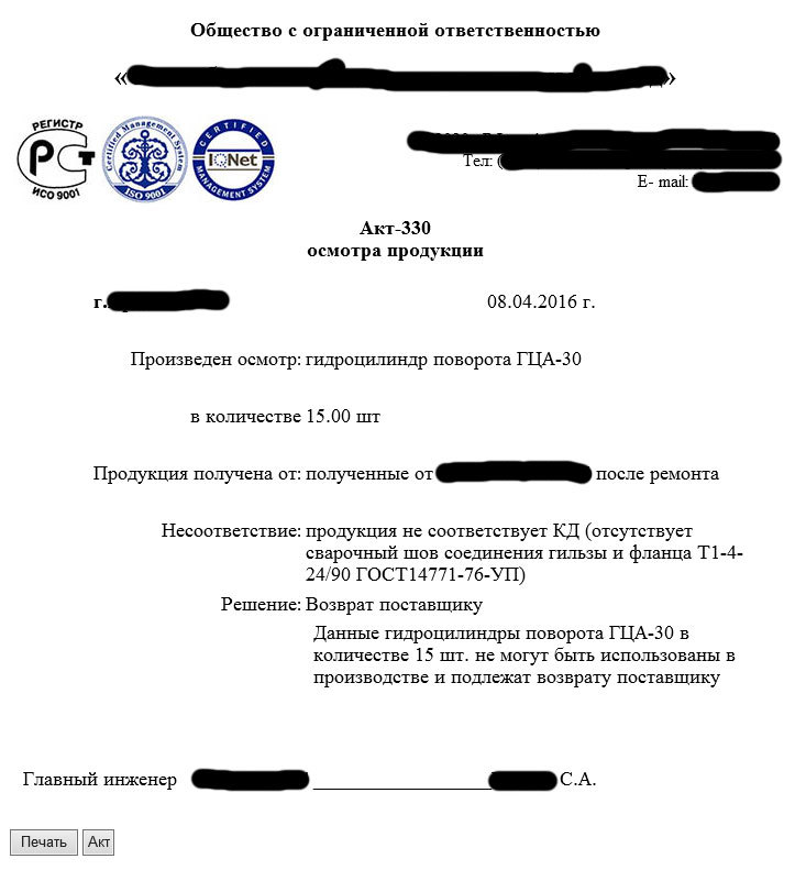 Главный инженер должен распечатать Претензию, подписать, поставить печать предприятия и передать Претензию Руководителю подразделения, ответственного за данную поставку несоответствующей продукции.