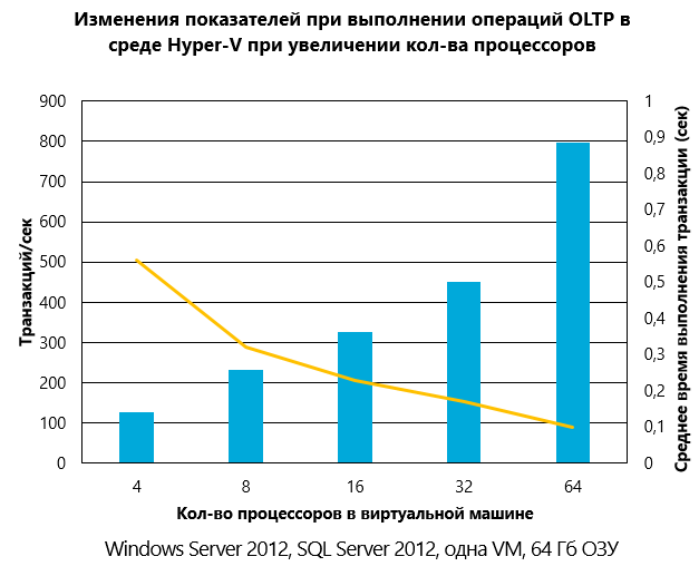 Hyper-V поддерживает до 64 процессоров на отдельную виртуальную машину, тесты показали увеличение производительности в 6 раз и 5-кратное повышение показателей времени выполнения транзакций. На иллюстрации ниже представлены основные результаты проведенных тестов. С подробным отчетом можно познакомиться здесь.