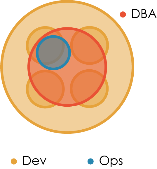 Этот вариант является ответом на ситуацию, описанную в Анти-типе G. Для закрытия пропасти между Dev и DBA некоторые организации сближают команду DBA с отдельной командой Dev, специализирующейся на доработке центральной БД. Это помогает в общении между людьми, привыкшими смотреть на БД как на объект разработки, в котором складируют данные приложения, и теми, кто воспринимает эту же базу как колоссальный объем сложной бизнес-информации.
