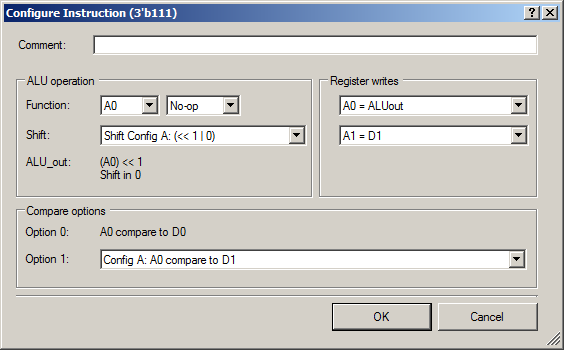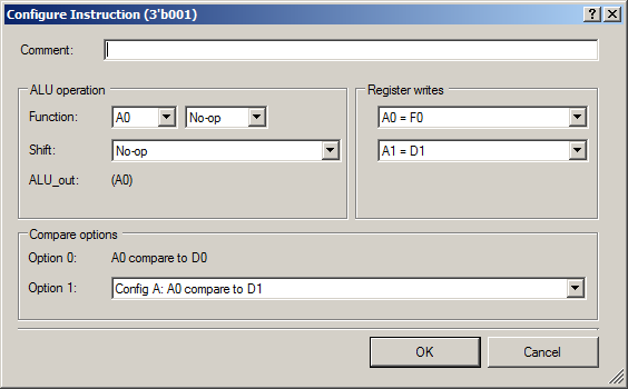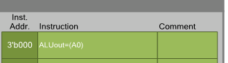 Итак. При текущей настройке входов, какой у автомата двоичный код состояния, такая инструкция АЛУ и используется. Когда мы находимся в состоянии Idle, имеющем код 000, используется нулевая инструкция. Вот она: