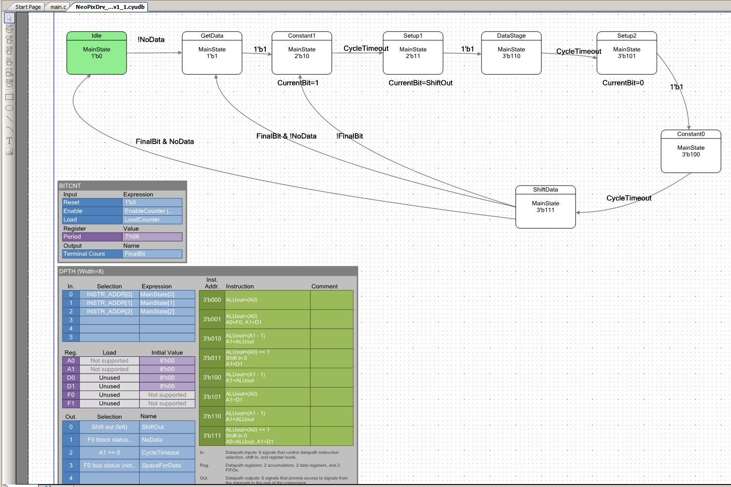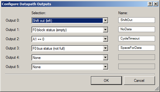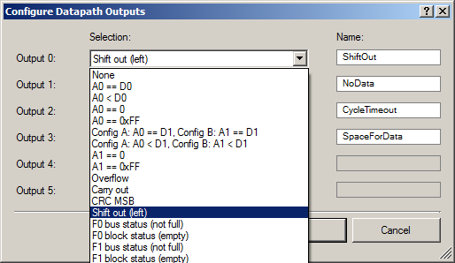 Теперь разберёмся, что это за загадочный флаг !NoData, заставляющий автомат покинуть состояние покоя. Это выход из блока Datapath. Всего можно описать до шести выходов. Просто Datapath может вырабатывать намного больше флагов, но трассировочных ресурсов на всех не хватит, поэтому надо выбрать, какие шесть (или менее) нам реально нужны. Вот список на рисунке: