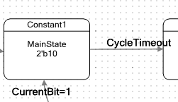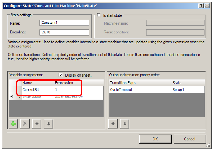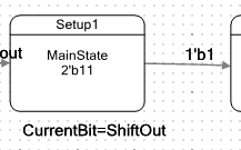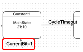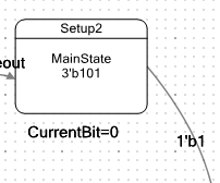 В этом состоянии автомат защёлкивает единицу в своём внутреннем триггере. Имя триггера CurrentBit. В оригинальном проекте это вообще был триггер, задающий состояние вспомогательного автомата. Я решил, что тот автомат только всех запутает, поэтому просто завёл триггер. Он нигде не описан. Но если войти в свойства состояния, в таблице видна такая запись: