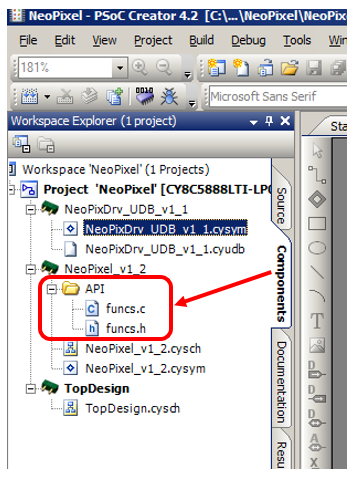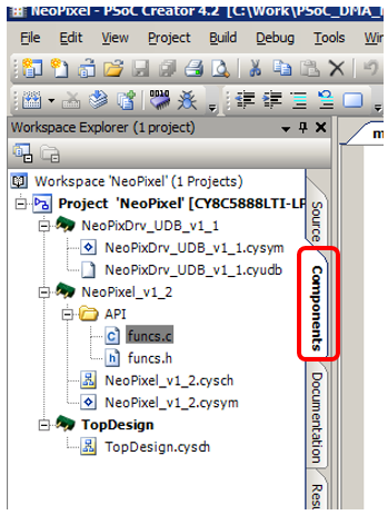 Группа Generated Source содержит библиотечные функции. Их лучше не править. После каждого изменения «прошивки» UDB эта группа будет генерироваться заново. Итак, где в этой идиллии размещено описание кода для UDB? Чтобы его увидеть, надо переключиться на вкладку Components: